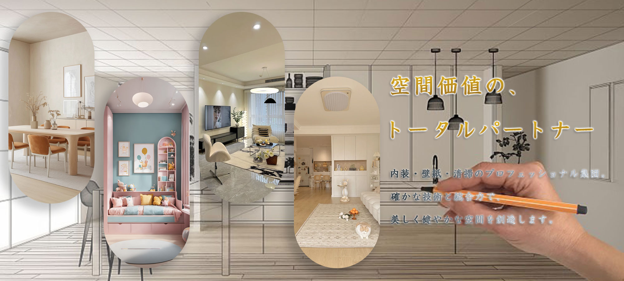 空間の本質的な価値を追求する、内装・壁紙・清掃のプロフェッショナル集団です。 お客様の「理想の空間」を、確かな技術と総合的なサポートで現実にいたします。 住まいと働く場に、美しさと快適さが息づく環境づくりを、トータルでお届けします。